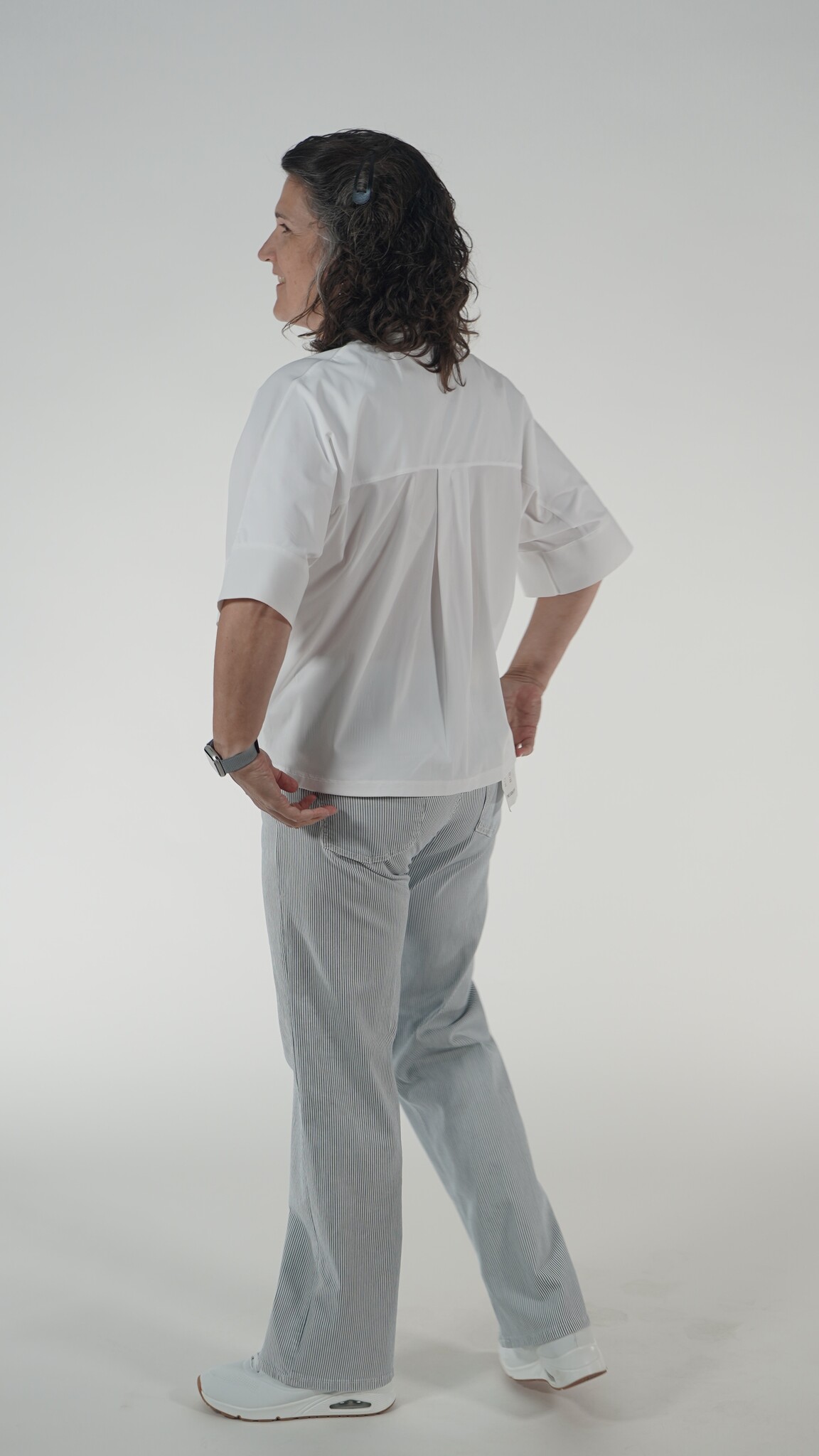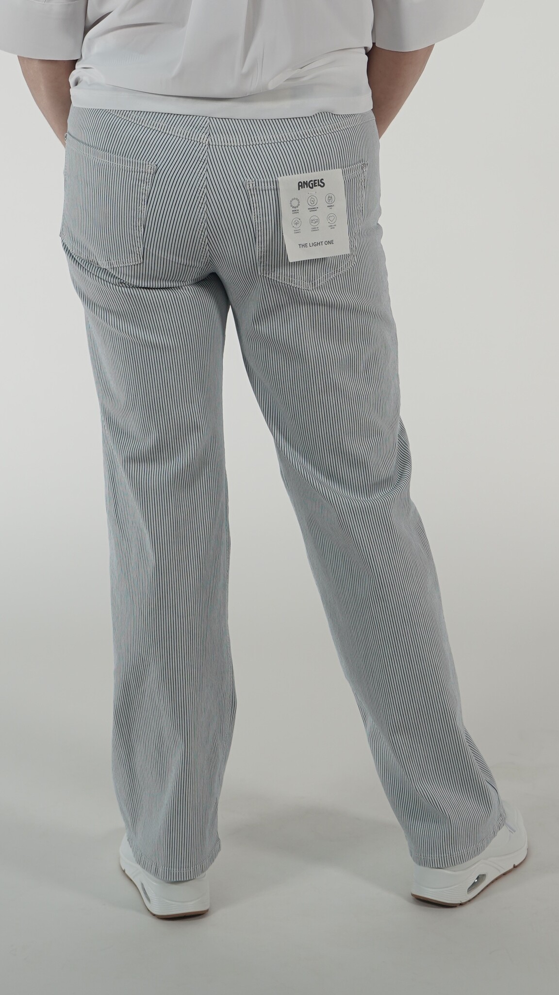 Off white met blauwe krijtstreep broek met rechte brede pijp.