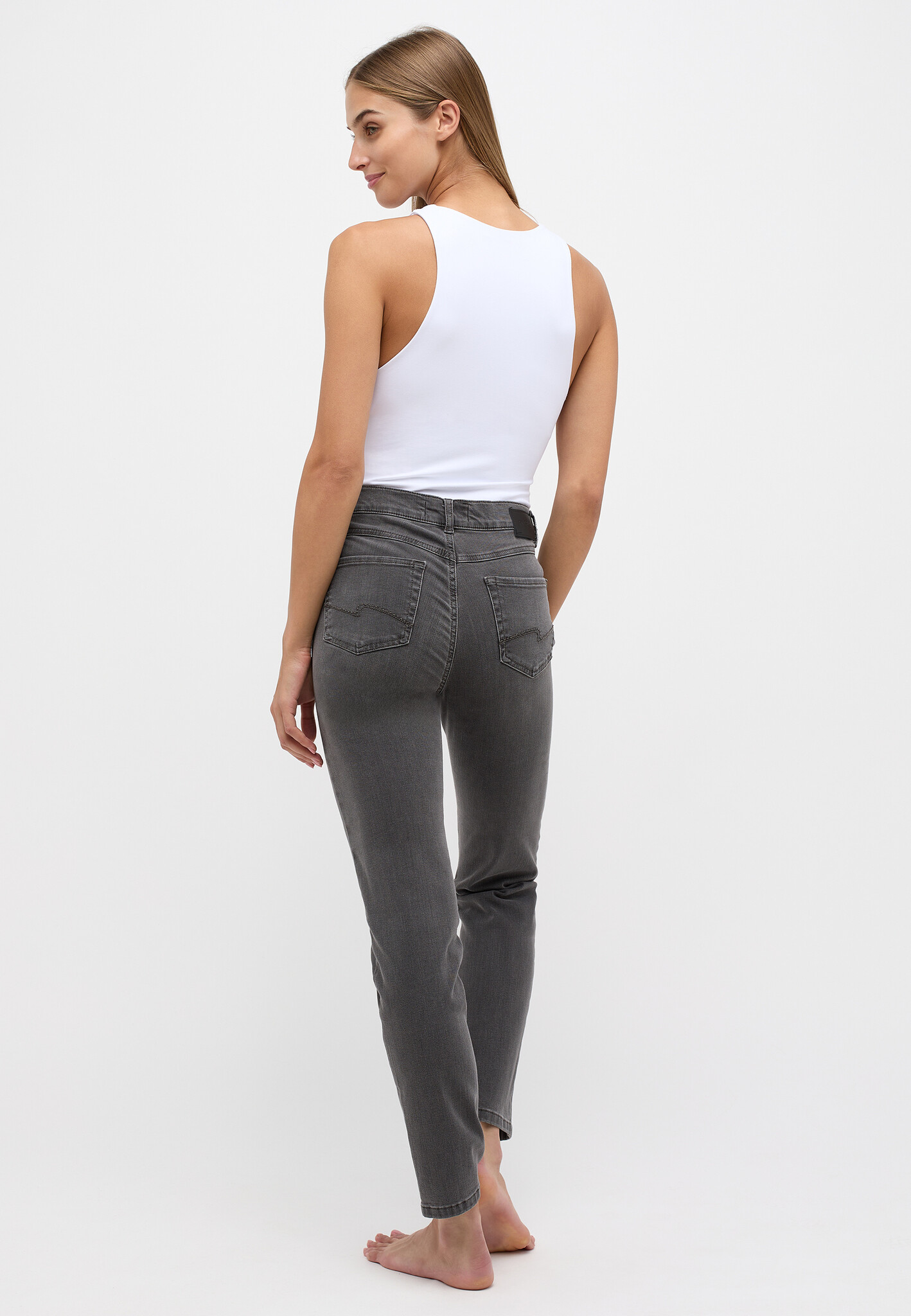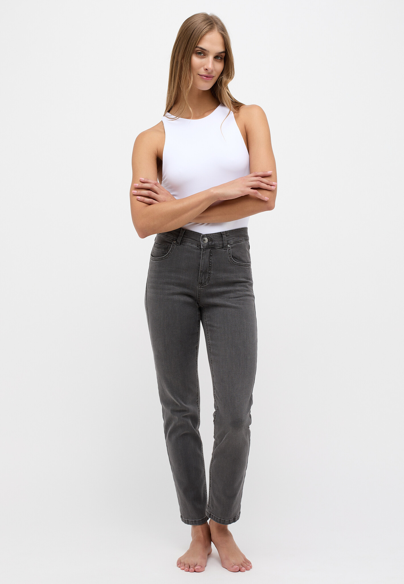 De basic broek met rechte pijp met een comfort-taille. De broek sluit met knoop en rits, maar heeft een deel elastiek in de taille.
