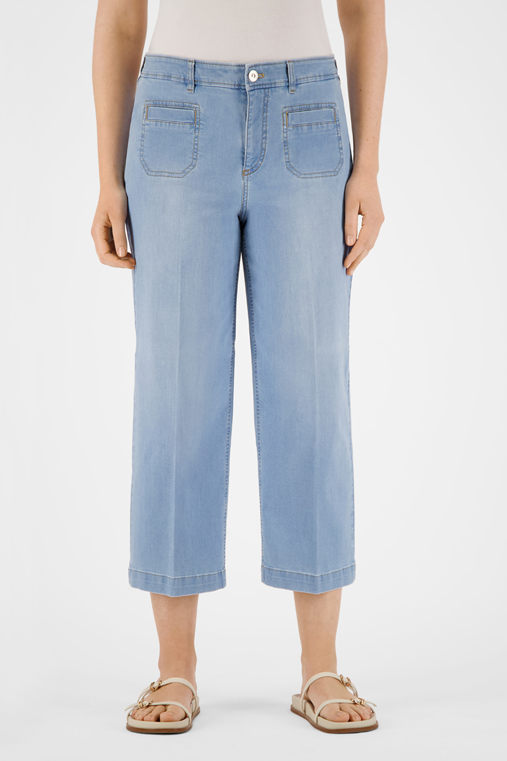 Zomerjeans 6/8 lengte met rechte brede pijp en fantasiezakje vooraan.