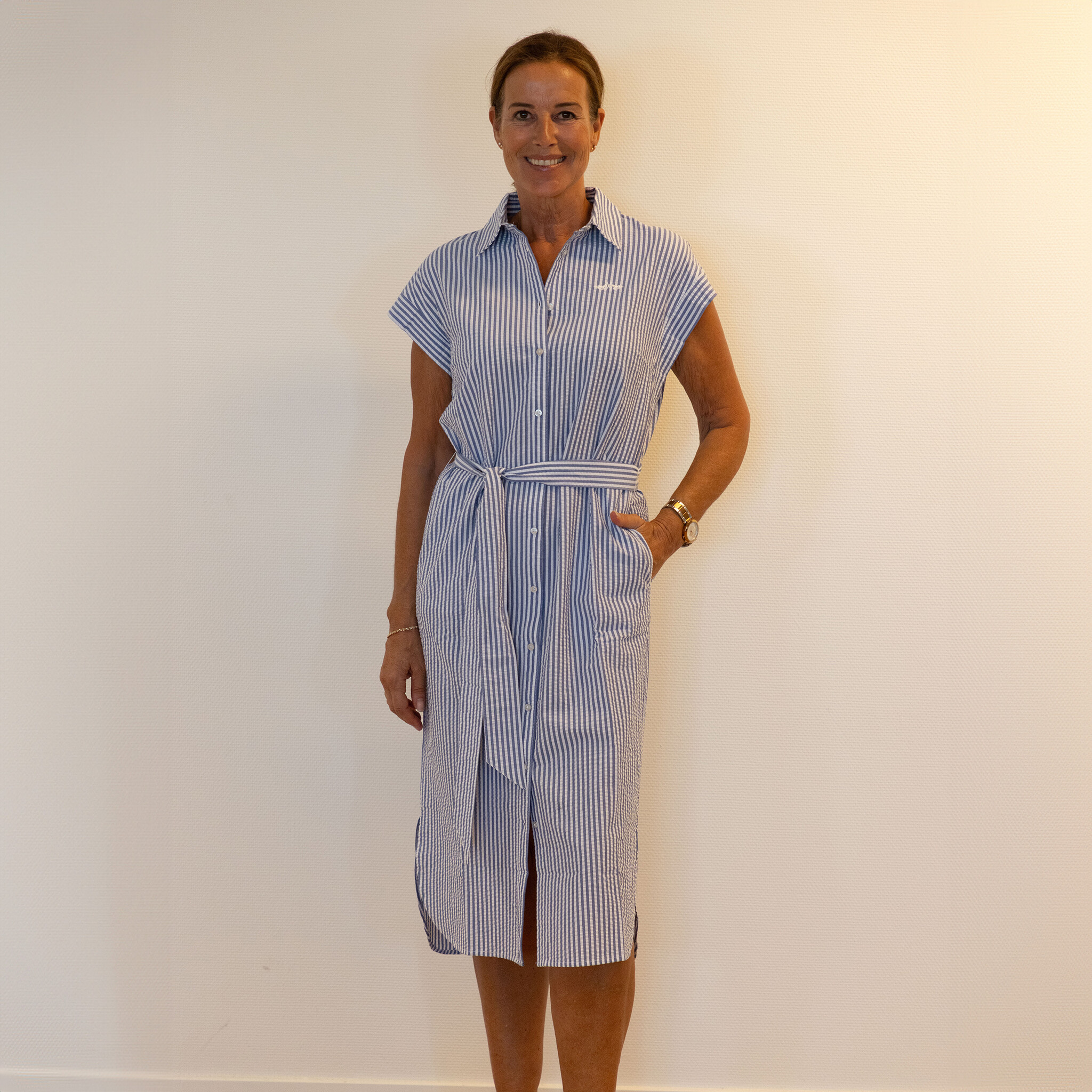 Jurk met aangeknipte mouwen in seersucker blauw-wit.