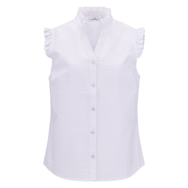 Blouse-top in witte seersucker met franjes aan armsgaten en hals.