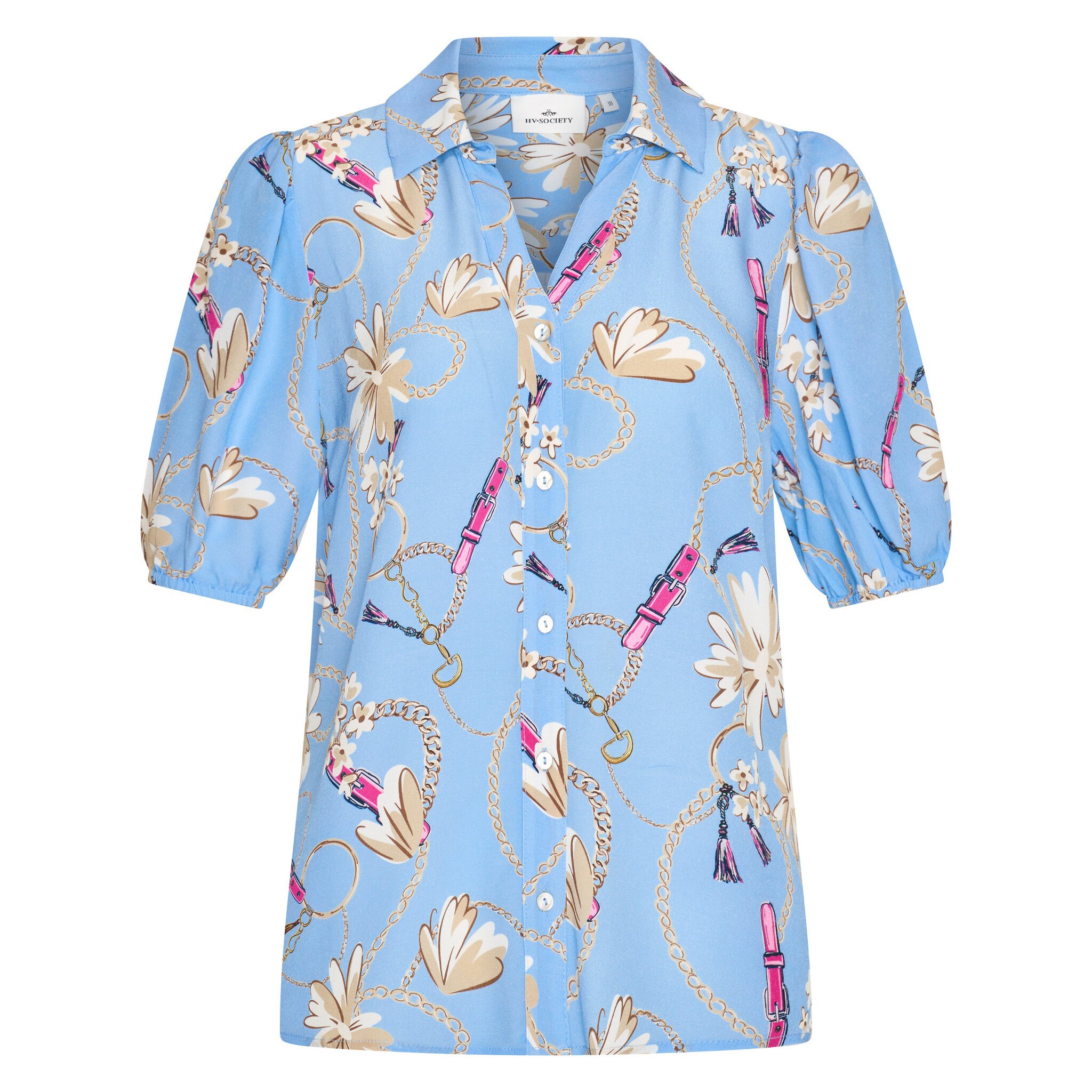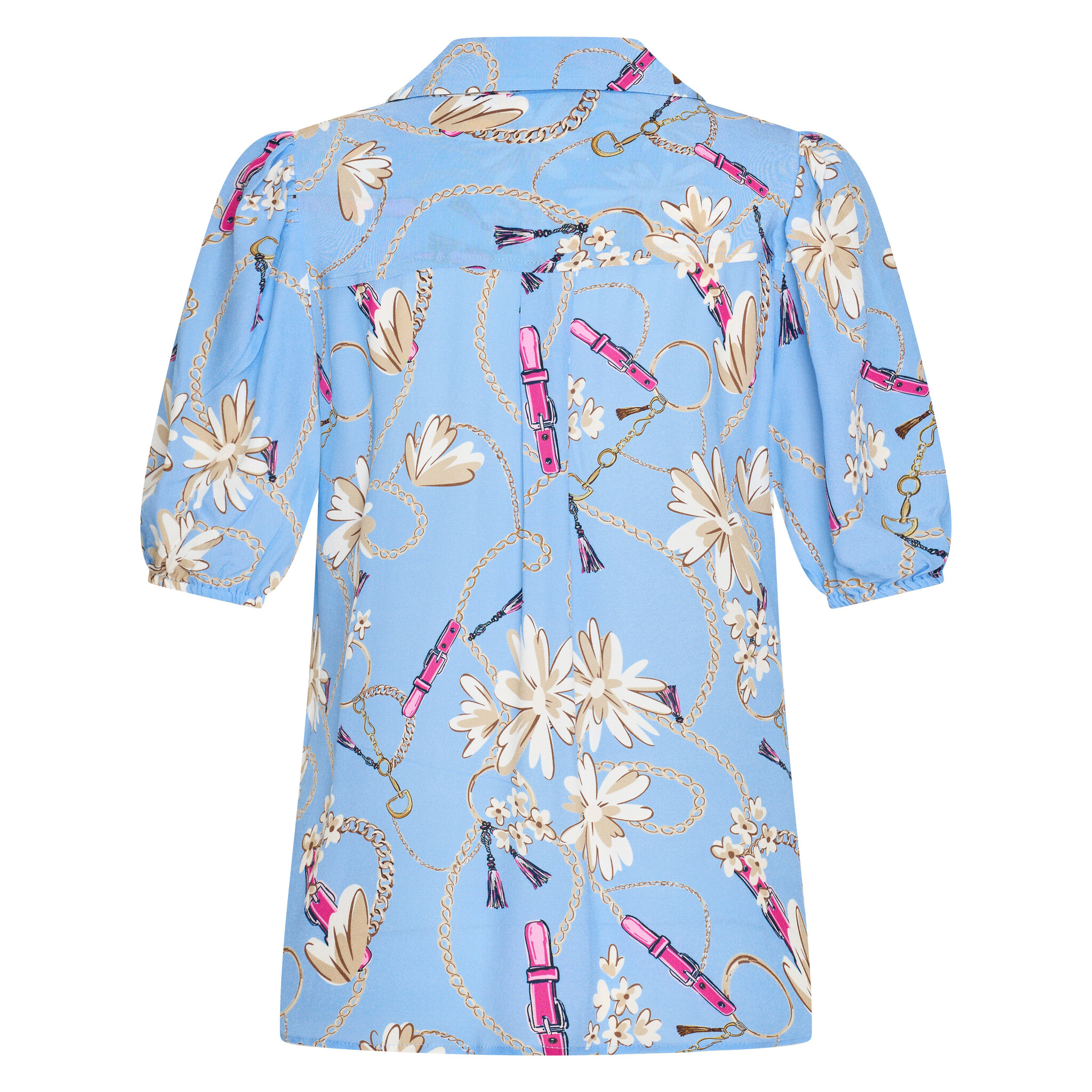 Blouse met V-hals en kraag. Korte pofmouwen .