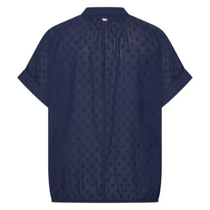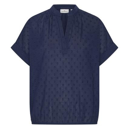 Donker blauwe katoenen blouse met aangeknipte mouwen en V-opening met pad en kraag. Ingeweven kleur op kleur bolletjes in de stof. Zoom afgewerkt met elastiek.