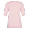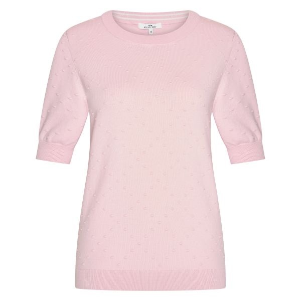 Licht roze trui met korte mouw tot aan de elleboog. Kleur op kleur bolletjes in het breiwerk.