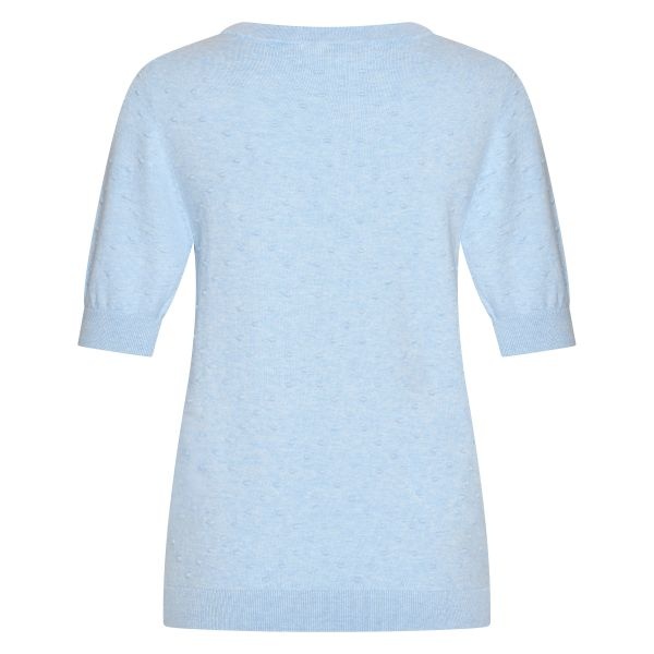 Licht blauwe trui met korte mouw tot aan de elleboog. Kleur op kleur bolletjes in het breiwerk.