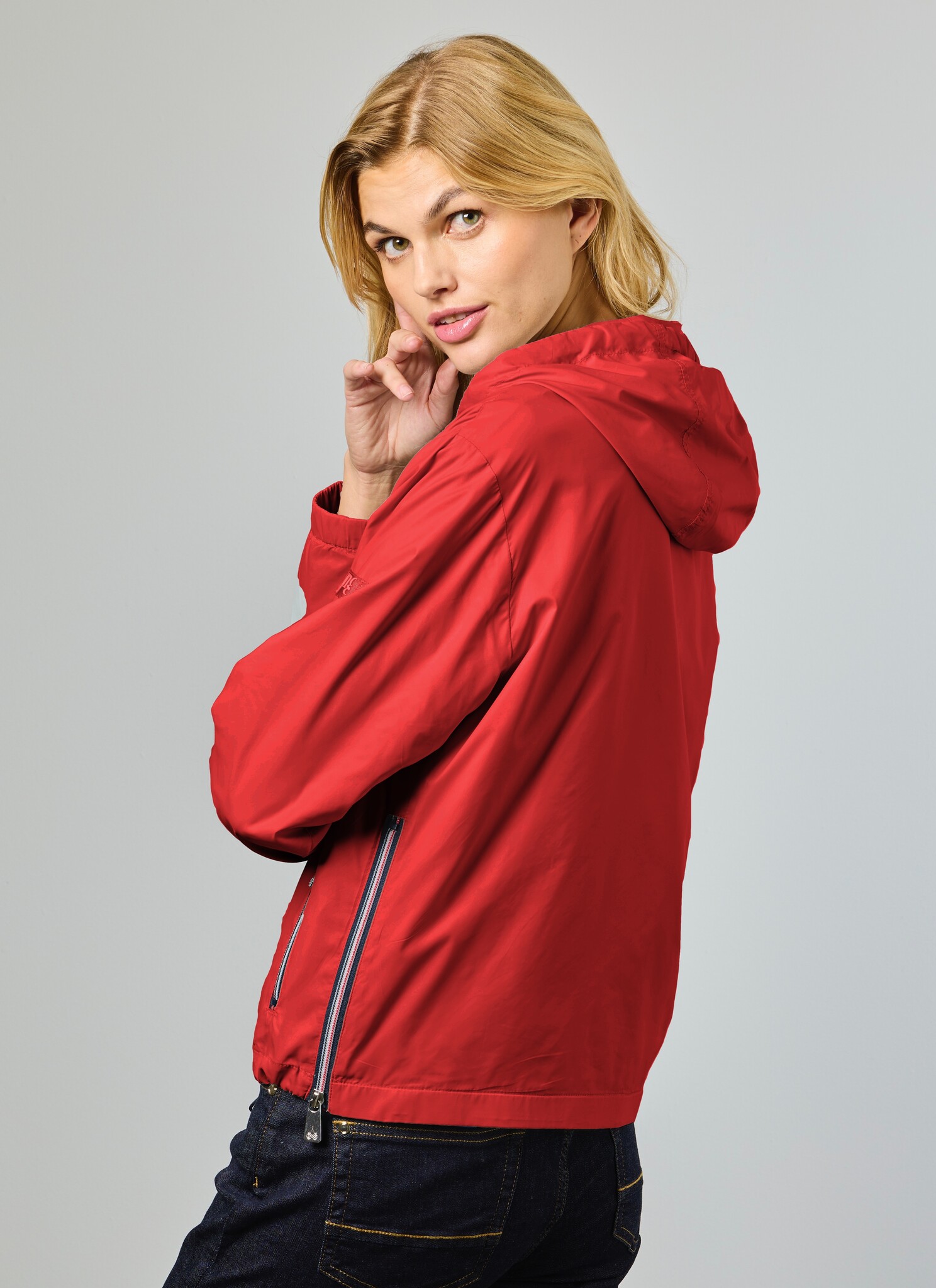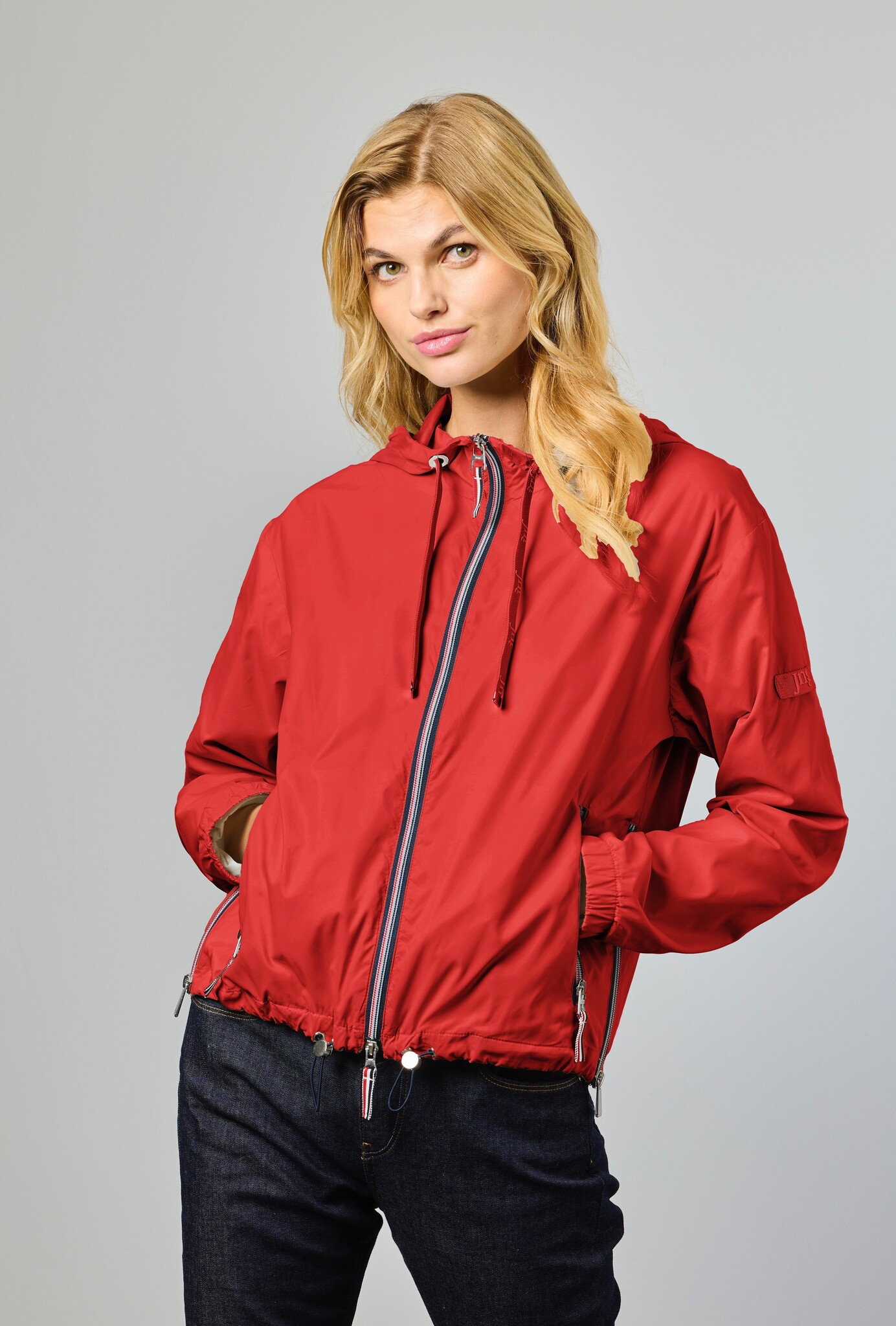Licht regenjasje met kap en leuke fantasieritsen vooraan en aan zakken.