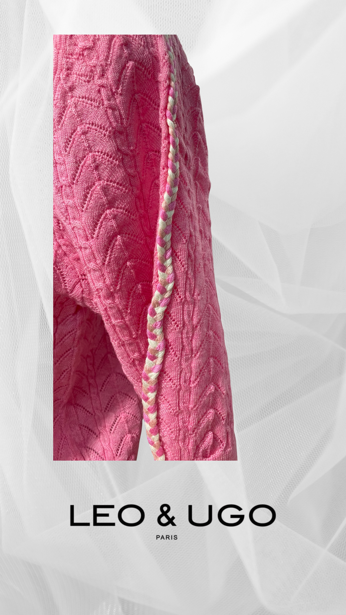 Lentetrui met korte mouwen. Over de mouw en schoudernaad loopt een gekleurde ketting.