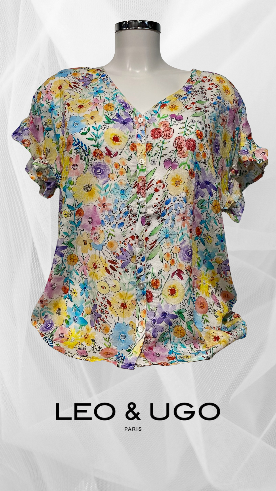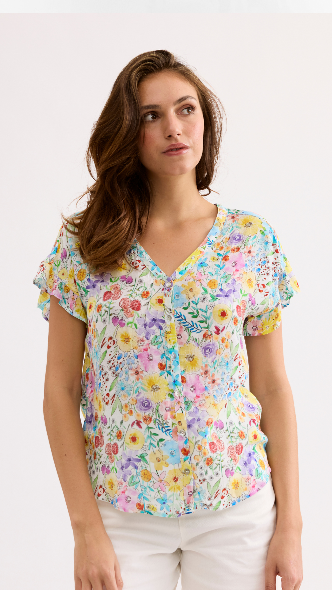 Zeer luchtig zomers blouse zonder mouwen. De armsgaten zijn afgewerkt met een ruche.