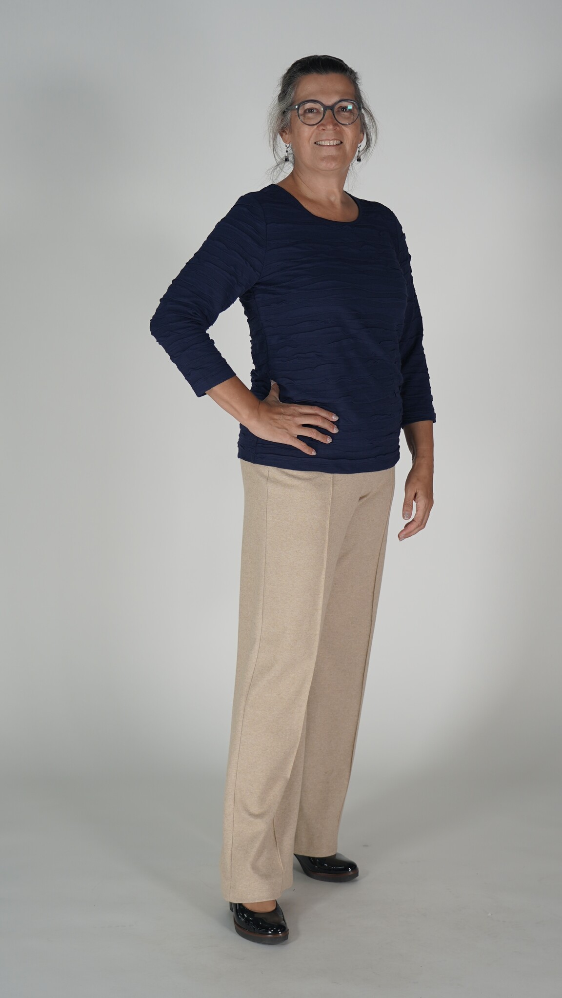 Basic donker blauw T-shirt met 3/4 mouwen, perfect voor een casual dagelijkse look. De stof met structuur geeft een elegante uitstraling en voegt een touch van sophistication toe aan uw outfit. Of u nu gaat voor een informele bijeenkomst of een dagje uit, deze T-shirt is de perfecte keuze.