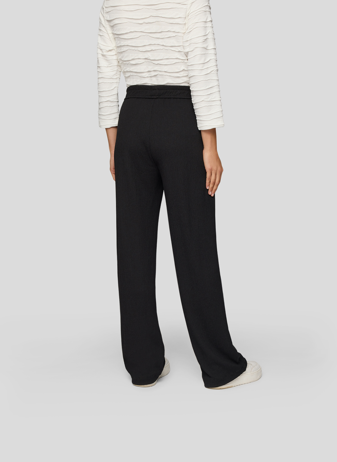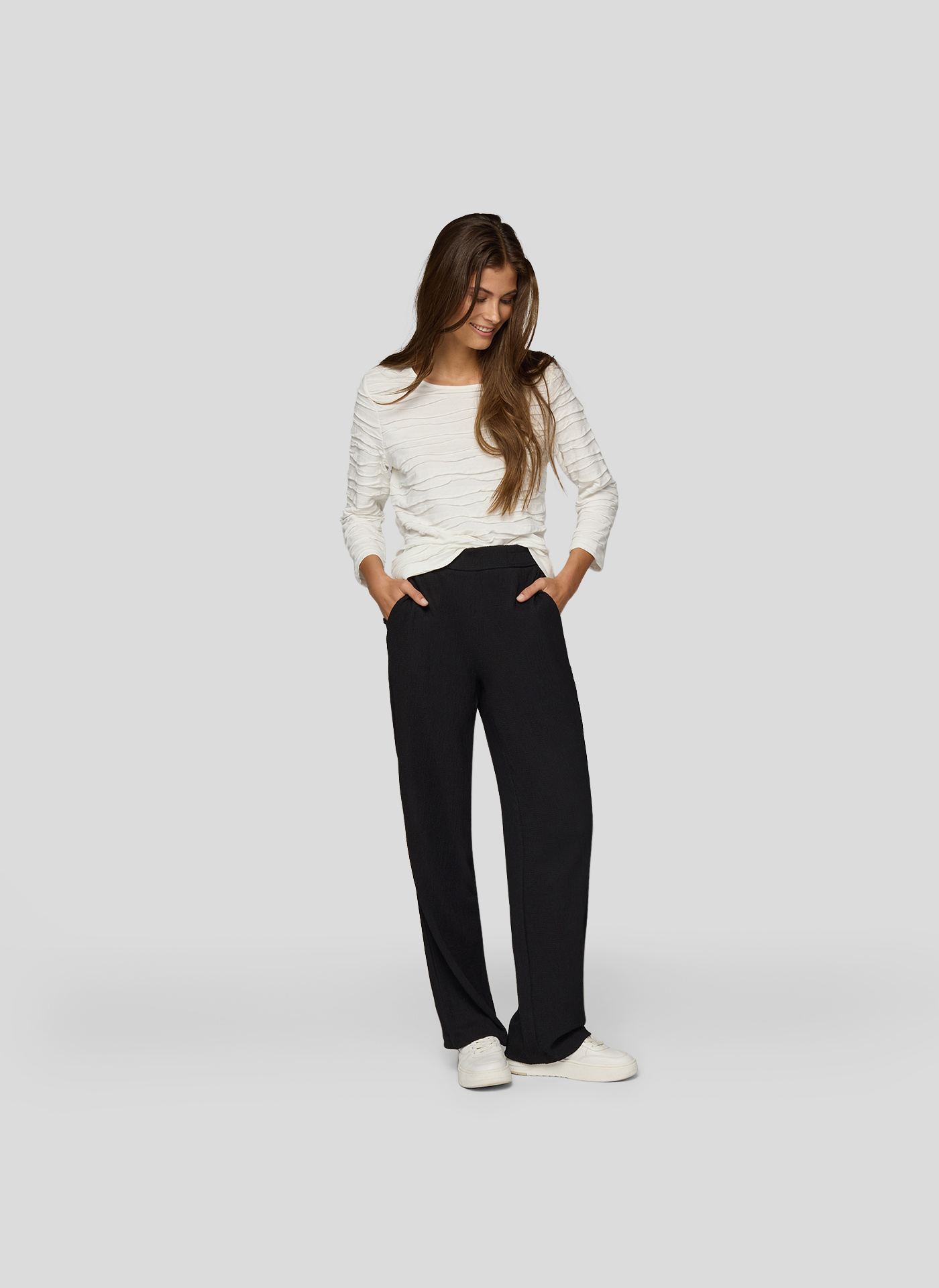 Zwarte broek met elastiek in de taille en wijde pijpen in soepel vallende stof met structuur. Deze broek is ideaal om de oneffenheden op je benen te camoufleren, zoals cellulite, littekens of andere onregelmatigheden.