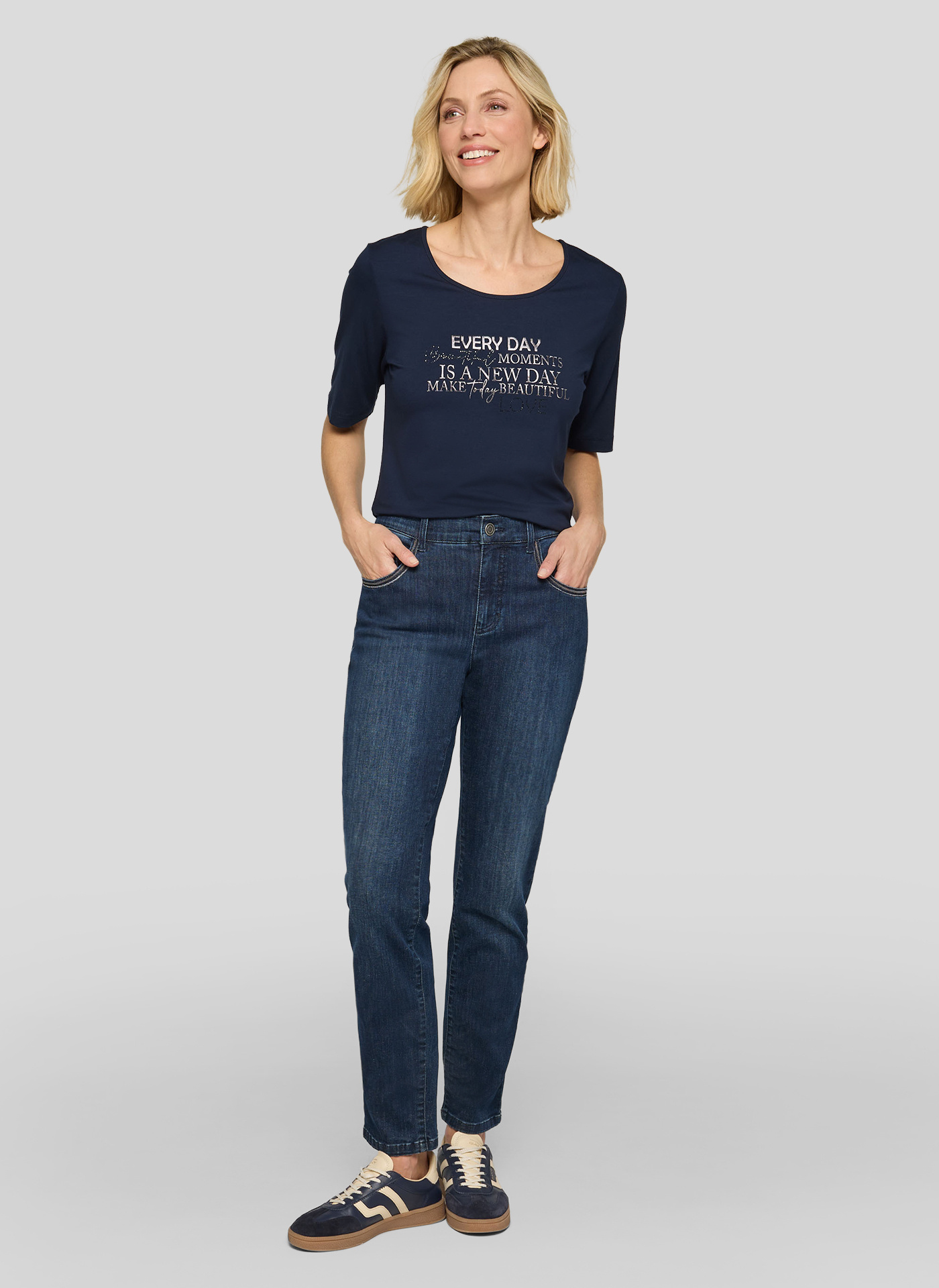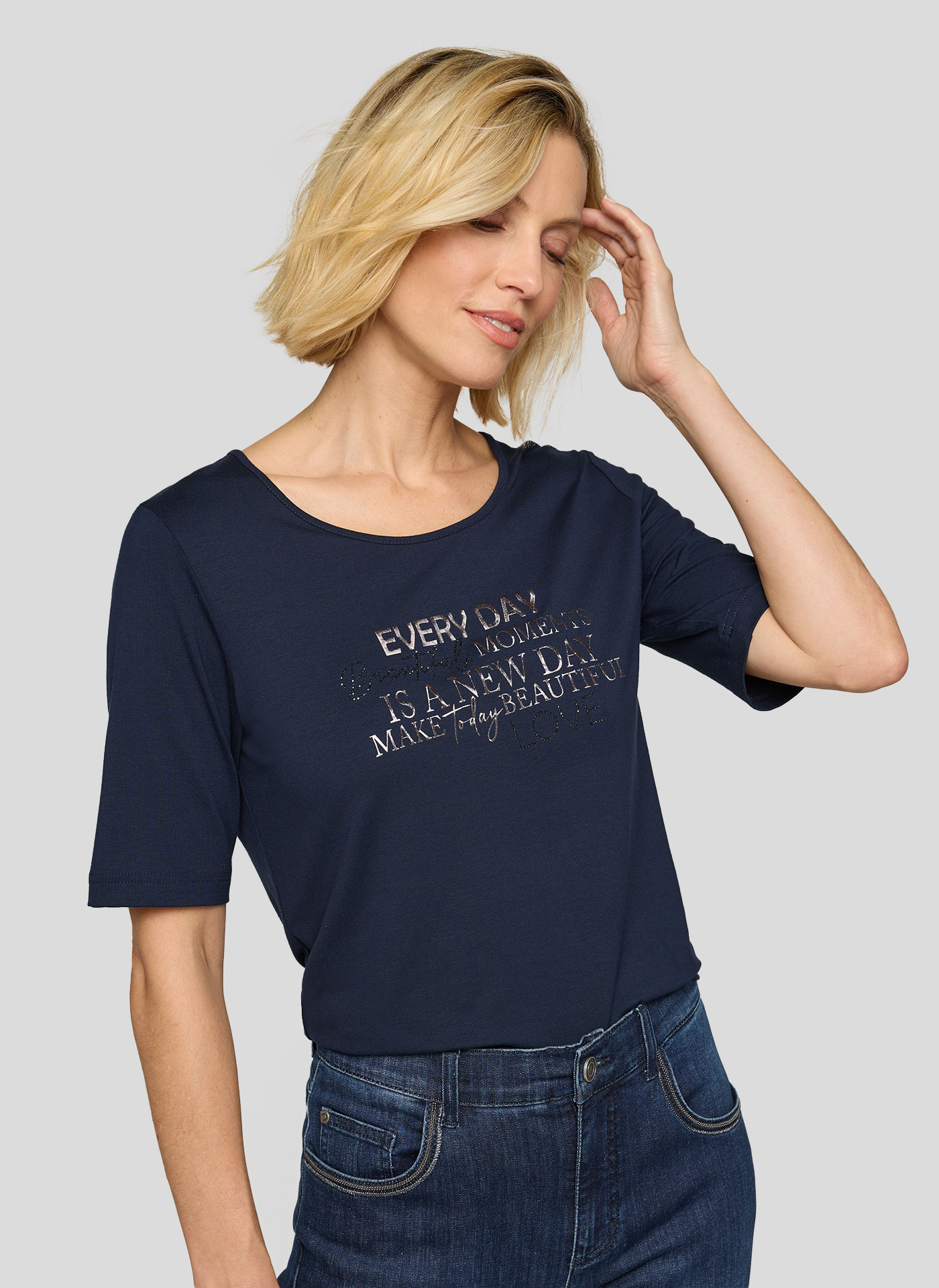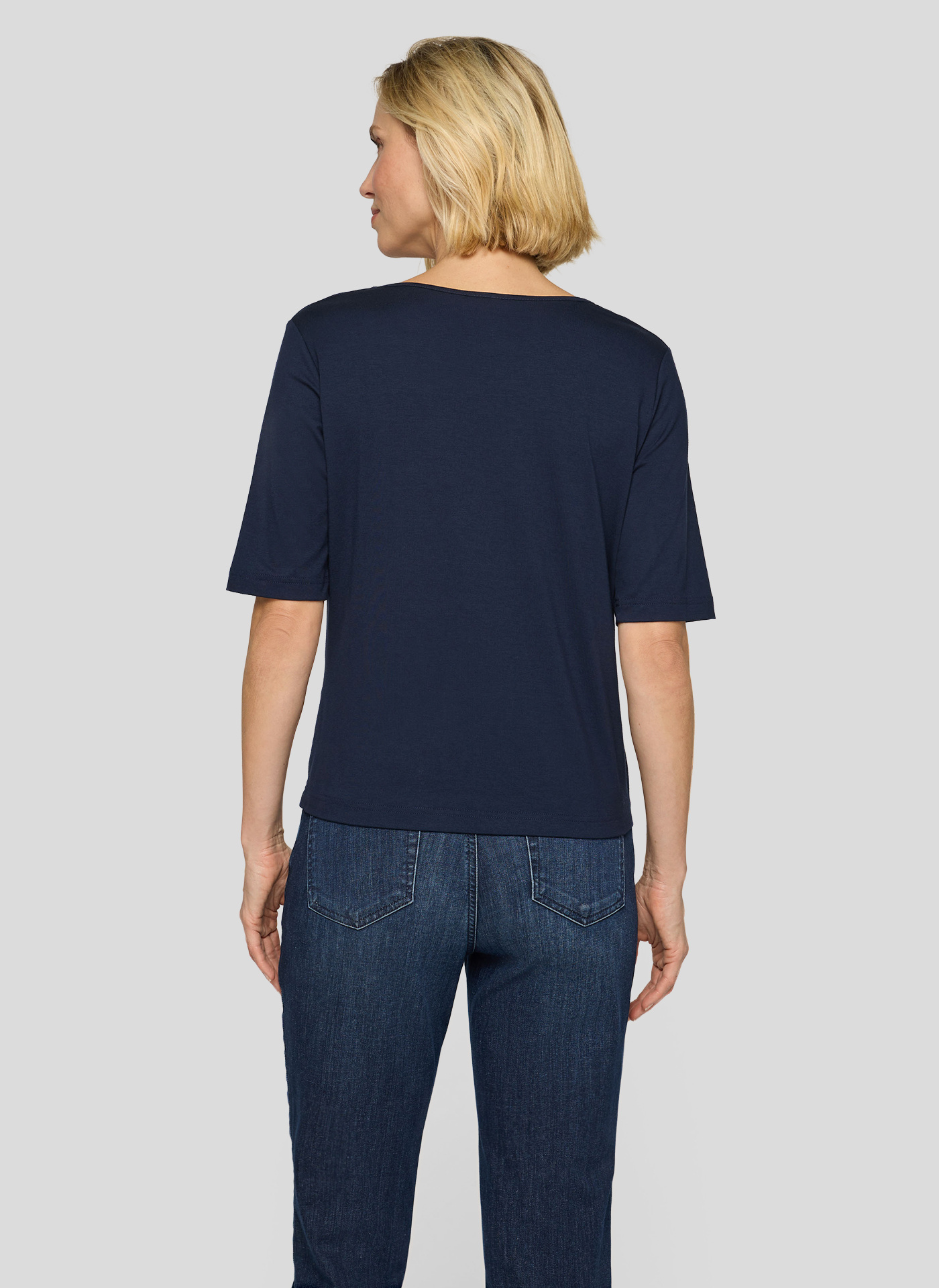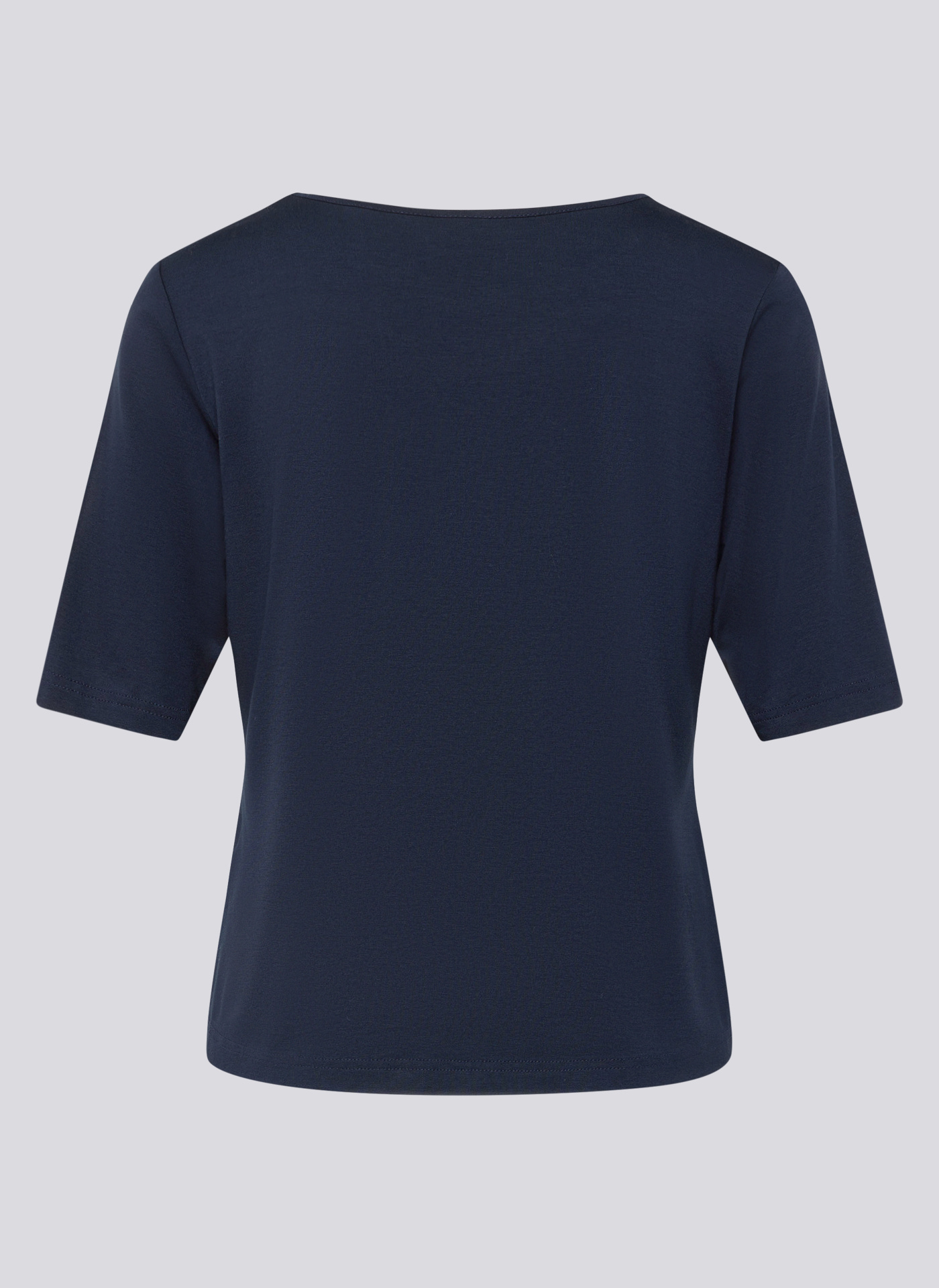 Donker blauw T-shirt met korte mouwen en ronde hals.