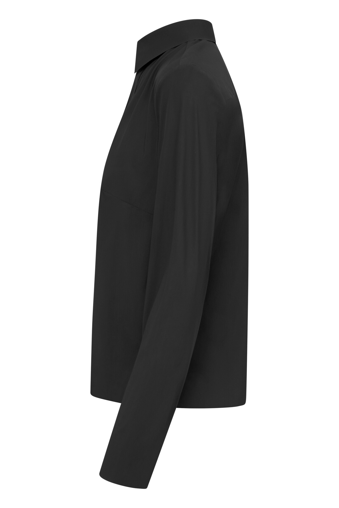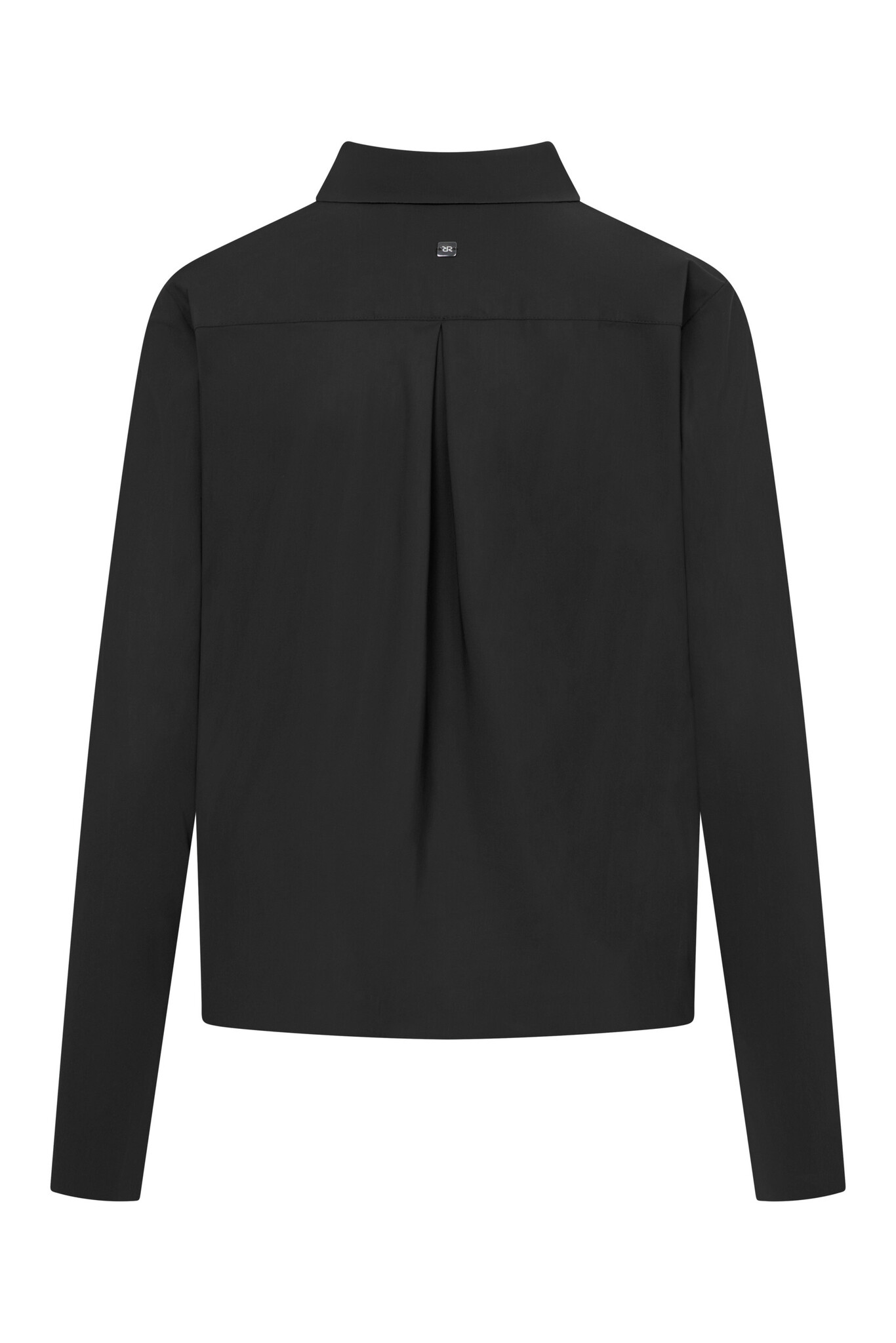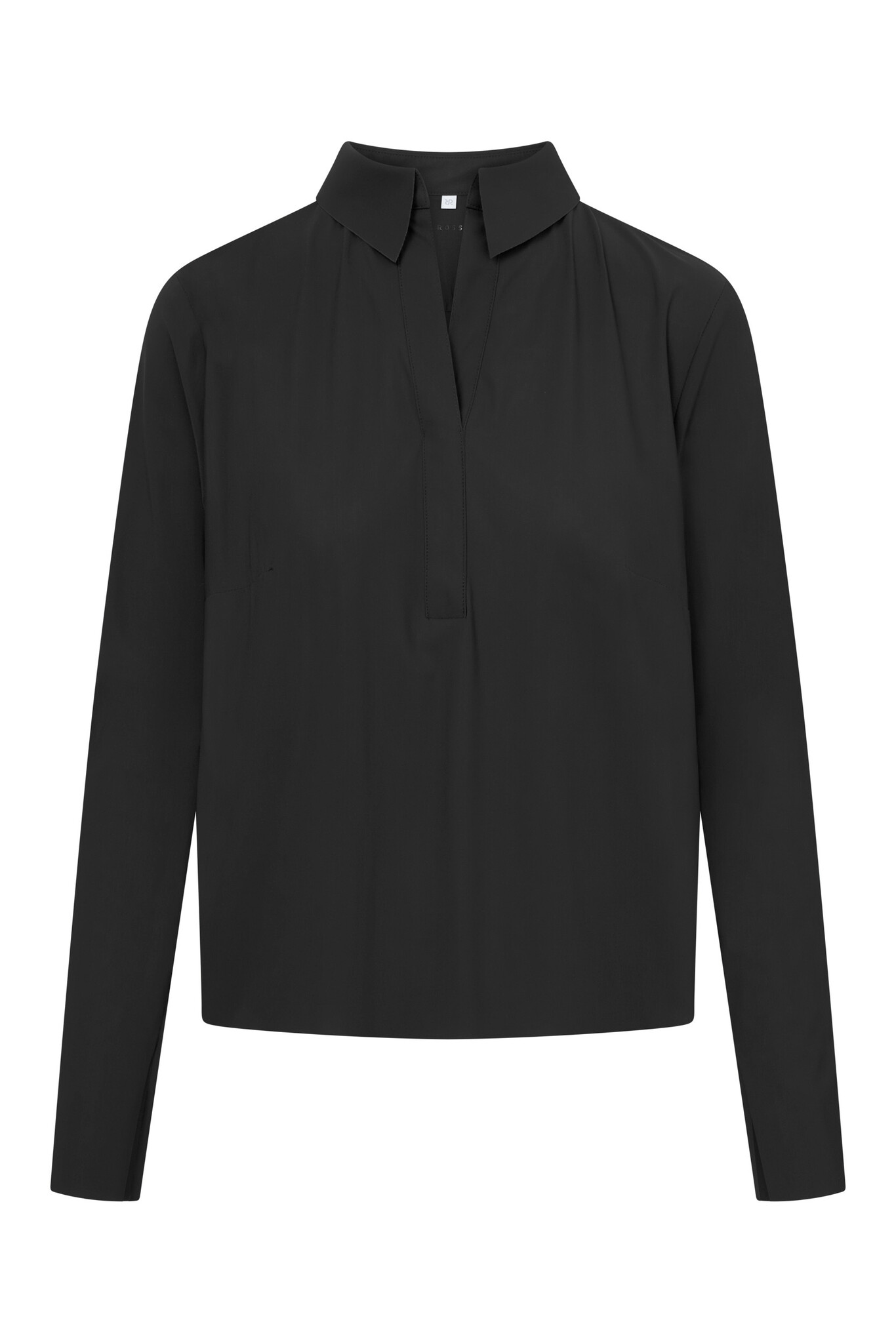 Donker blauwe blouse met polopat en lange mouwen in soepele microfiber.