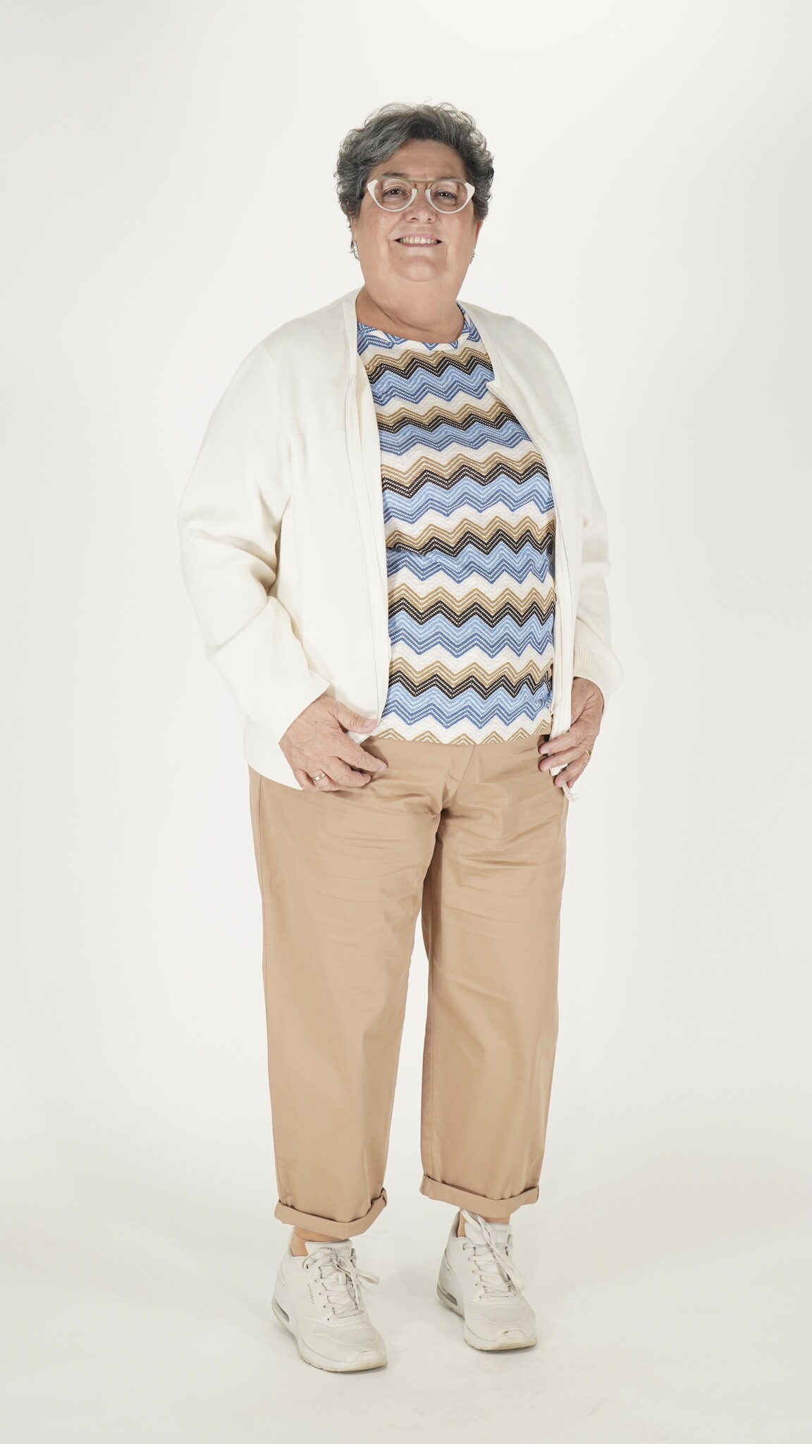 Luchtige katoenen zomerbroek met schuine steekzakken, rits en knoop. Pijpen licht naar onder toe inlopend.