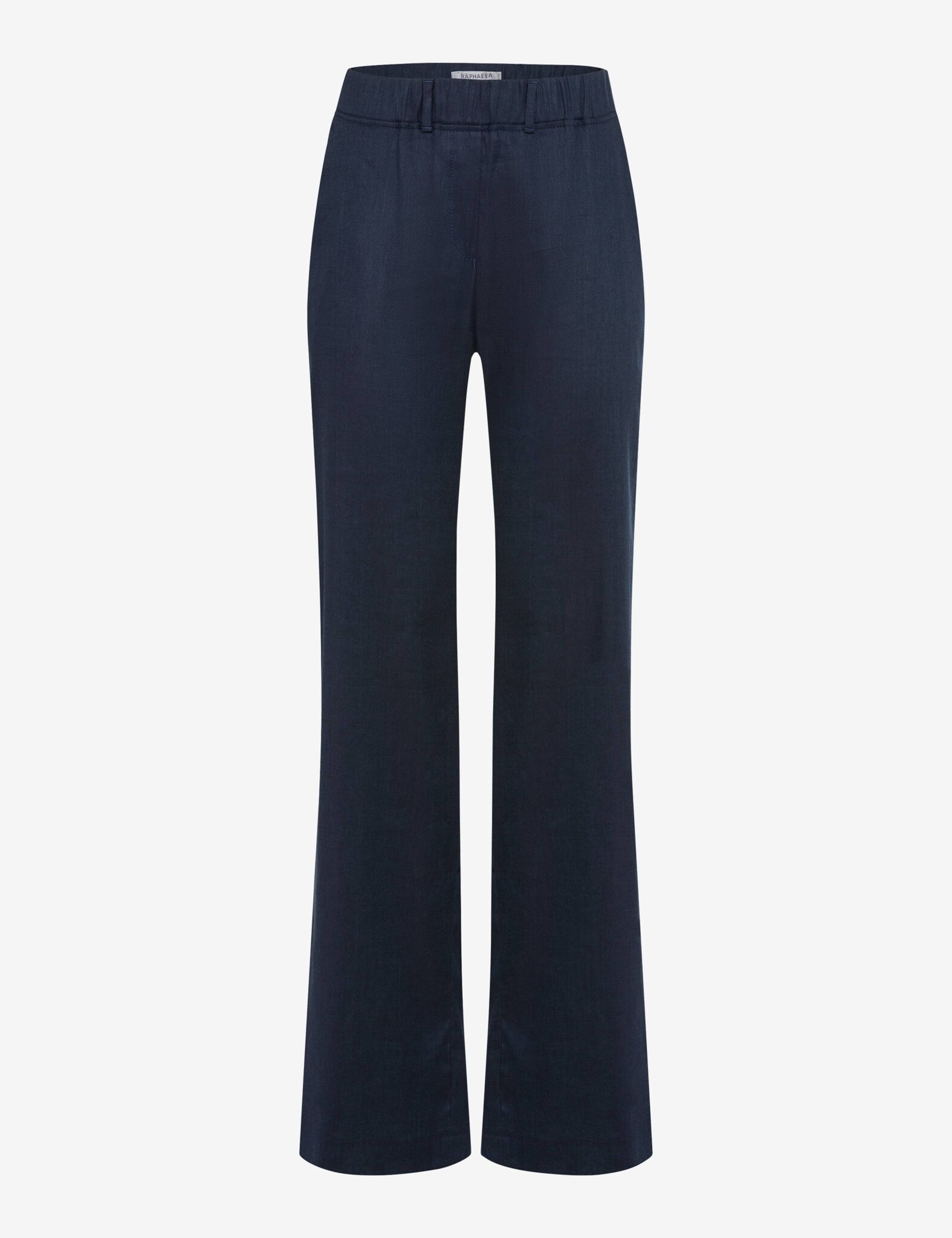 Donker blauwe linnen broek met elastiek in de taille en wijde, rechte pijpen.