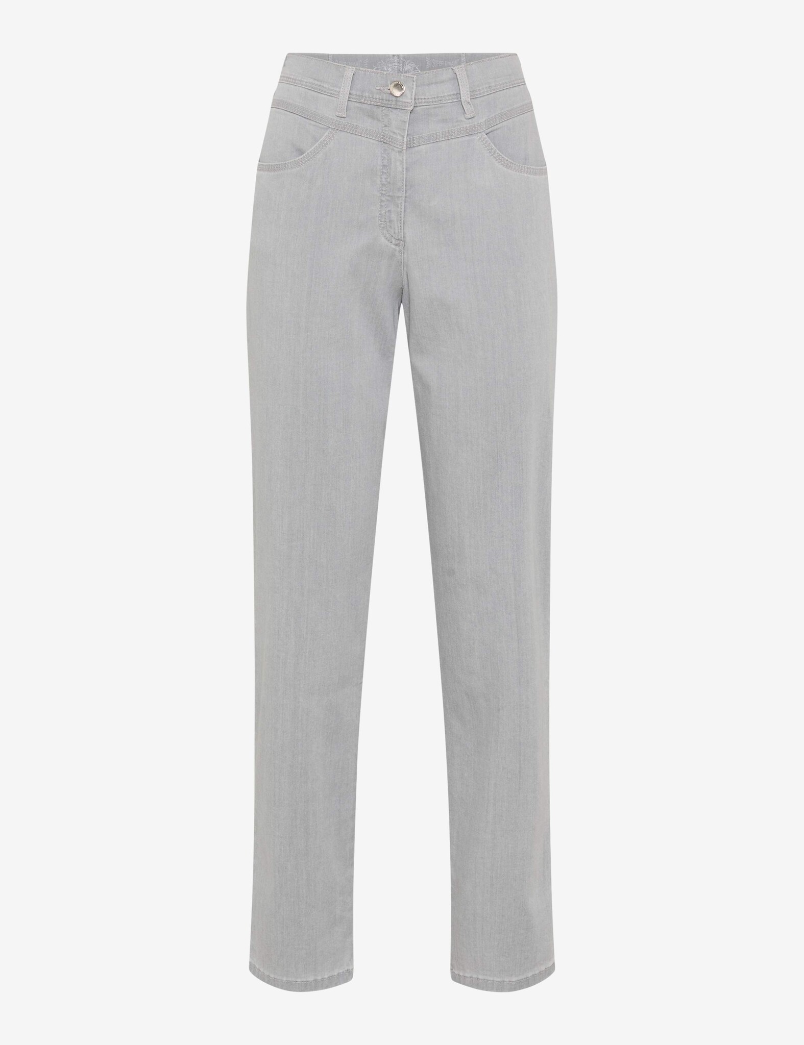 Lichte grijze zomerjeans met Comfort Plus Fit. Deze broek is speciaal voor dames met zware benen. De pijpen van de broek zijn breder dan een doorsnee jeans, maar zonder de modieuze brede pijpen.