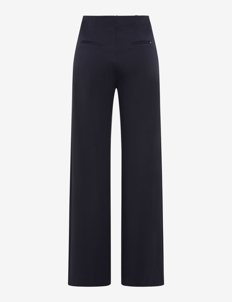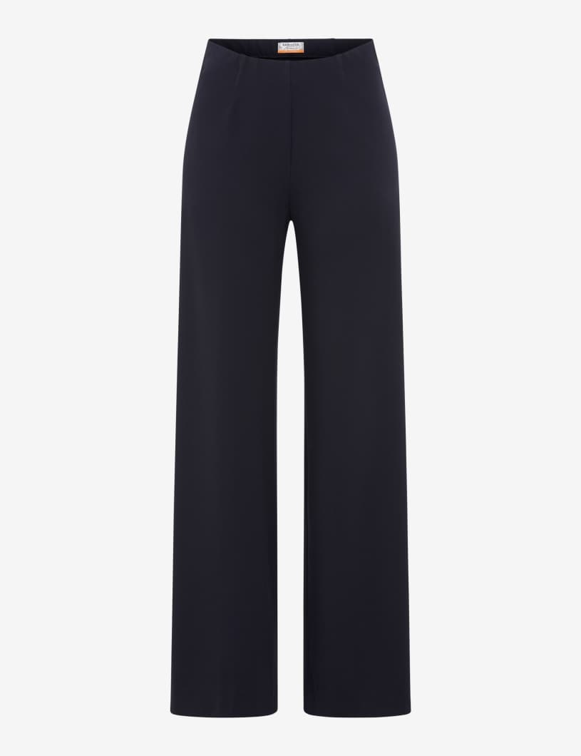 Donker blauwe broek met brede pijpen, taille afgewerkt met elastiek, uitgewerkt in stevige winterjersey.